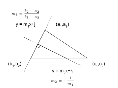 | Perpendicular Bisector of \(\overline{\rm AB}\) where \({\rm A} = (x_{1}, y_{1})\) and \({\rm B} = (x_{2}, y_{2})\) | \( \begin{align} y &= m_{2}(x - \overline{x}) + \overline{y} \\ &= \frac{x_{1} - x_{2}}{y_{2} - y_{1}}\left(x - \frac{x_{1} + x_{2}}{2} \right) + \frac{y_{1} + y_{2}}{2} \end{align} \) |