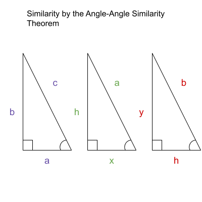 Figure above not drawn to scale. Proportionalities: \[ \frac{x}{a} = \frac{a}{c} \] \[ \frac{y}{b} = \frac{b}{c} \] \[ \frac{x}{h} = \frac{h}{y} \] |