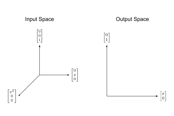 \[ \textbf{A}f = \begin{bmatrix} 2 & 0 & 0 \\ 0 & 1 & 0 \end{bmatrix} \begin{bmatrix} a \\ b \\ c \end{bmatrix} = \begin{bmatrix} 2a \\ b \end{bmatrix} \]Referring back to the output basis, this is really