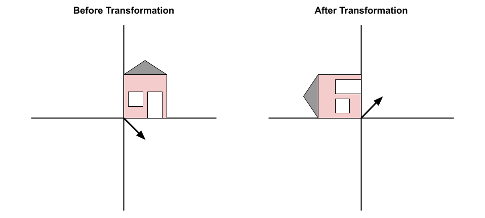 Transformations act on all points in space at once. The house can be thought of as a connection of multiple vectors. This specific transformation performs a 90 degree rotation on all vectors in the plane.