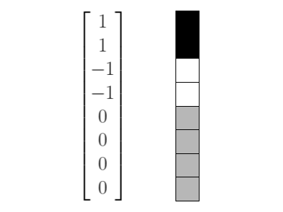 \[ \left\{ \begin{pmatrix} 1 \\ 1 \\ 1 \\ 1 \\ 1 \\ 1 \\ 1 \\ 1 \end{pmatrix}, \begin{pmatrix} 1 \\ 1 \\ 1 \\ 1 \\ -1 \\ -1 \\ -1 \\ -1 \end{pmatrix}, \begin{pmatrix} 1 \\ 1 \\ -1 \\ -1 \\ 0 \\ 0 \\ 0 \\ 0 \end{pmatrix}, \begin{pmatrix} 0 \\ 0 \\ 0 \\ 0 \\ 1 \\ 1 \\ -1 \\ -1 \end{pmatrix}, \begin{pmatrix} 1 \\ -1 \\ 0 \\ 0 \\ 0 \\ 0 \\ 0 \\ 0 \end{pmatrix}, \begin{pmatrix} 0 \\ 0 \\ 1 \\ -1 \\ 0 \\ 0 \\ 0 \\ 0 \end{pmatrix}, \begin{pmatrix} 0 \\ 0 \\ 0 \\ 0 \\ 1 \\ -1 \\ 0 \\ 0 \end{pmatrix}, \begin{pmatrix} 0 \\ 0 \\ 0 \\ 0 \\ 0 \\ 0 \\ 1 \\ -1 \end{pmatrix} \right\} \]Notice that with both of these matrices, they can represent every vector in \(\mathbb{R}^{8}\).